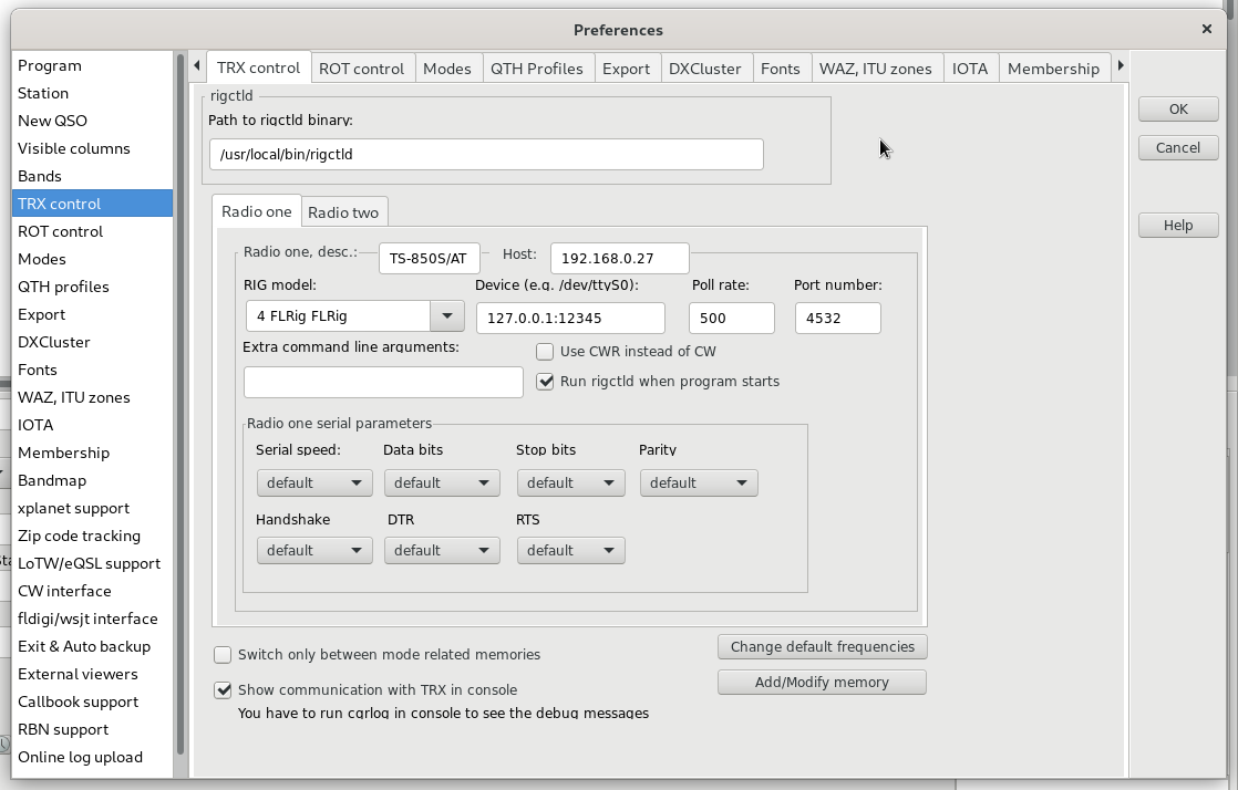 TS-850 <--serial-- flrig <--port 12345--> Fldigi