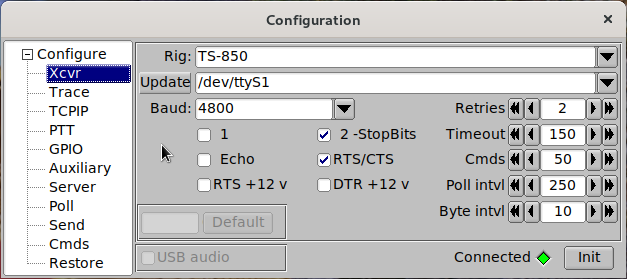 Fldigi can talk either to rigctld or flrig's XML-RPC, and it does both very well. If this were our destination, either radio-connection (flrig or rigctld) will work. Summary - we can talk to the '850 with either flrig or rigctld. I've had excellent (contest / multi-day) stability with rigctld.